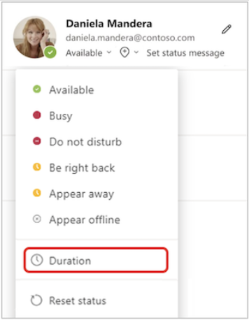SET A DURATION FOR YOUR STATUS When you want to change your status for a specific period of time – for example, to set ‘Do not disturb’ for an hour of concentrated work – you can set a duration so that Teams will automatically reset your status at the end of the allotted time.