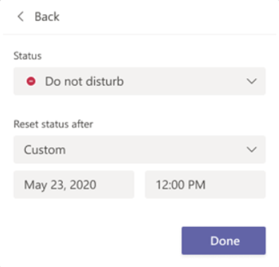 At the end of the period you entered, Teams will automatically reset your status based on your activity, your calendar, and the state of your computer.
