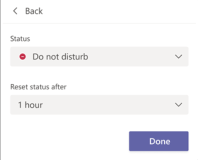 SET A DURATION FOR YOUR STATUS When you want to change your status for a specific period of time – for example, to set ‘Do not disturb’ for an hour of concentrated work – you can set a duration so that Teams will automatically reset your status at the end of the allotted time.