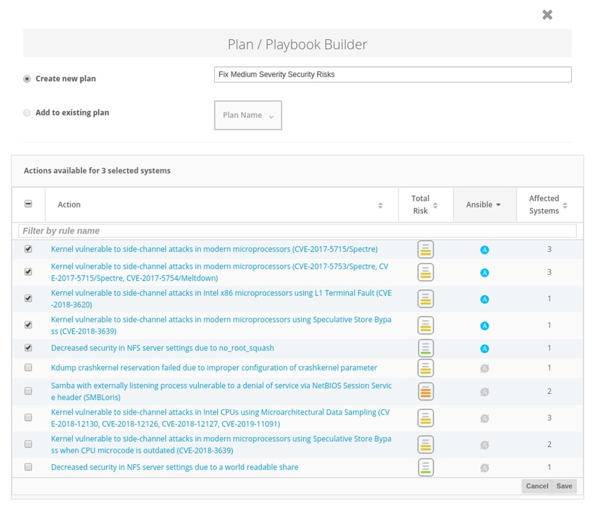 7. Navigate to Insight → Inventory. Select the hosts on which you want to rectify the discovered issues and select ‘Create a new Plan/Playbook’ from the Actions: