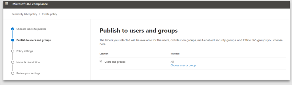 3. Select Users and groups who will be allowed to use the label. In this example it is published to all users and groups, thus making it available to every user in the organisation