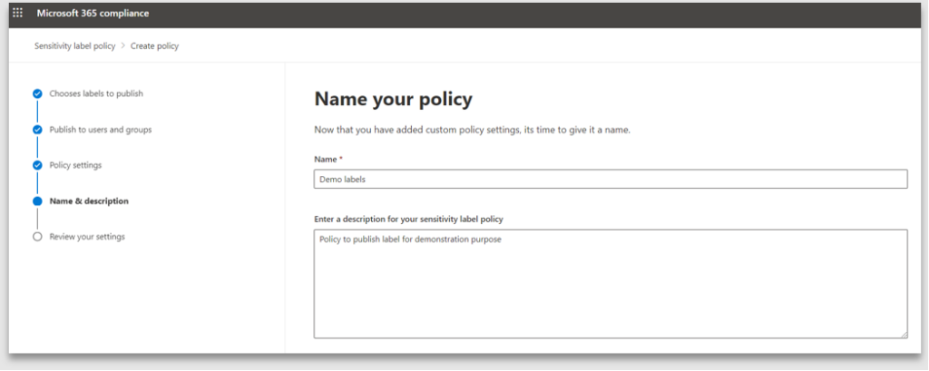 2. Provide a name for the label. This can be different to the Display name; M365 administrators use this while managing and publishing the label. The display name and description are seen by the end-user