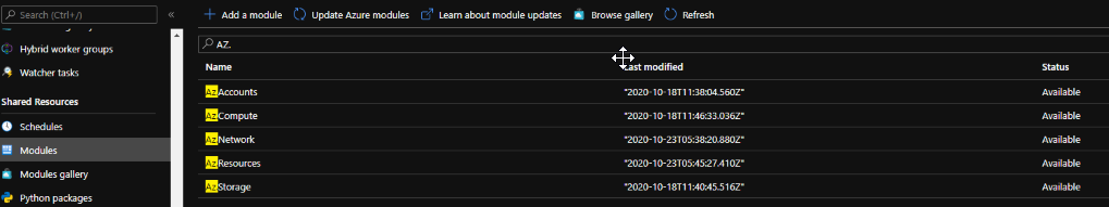 - You must import the following modules into the Automation Account (they are available in the gallery)