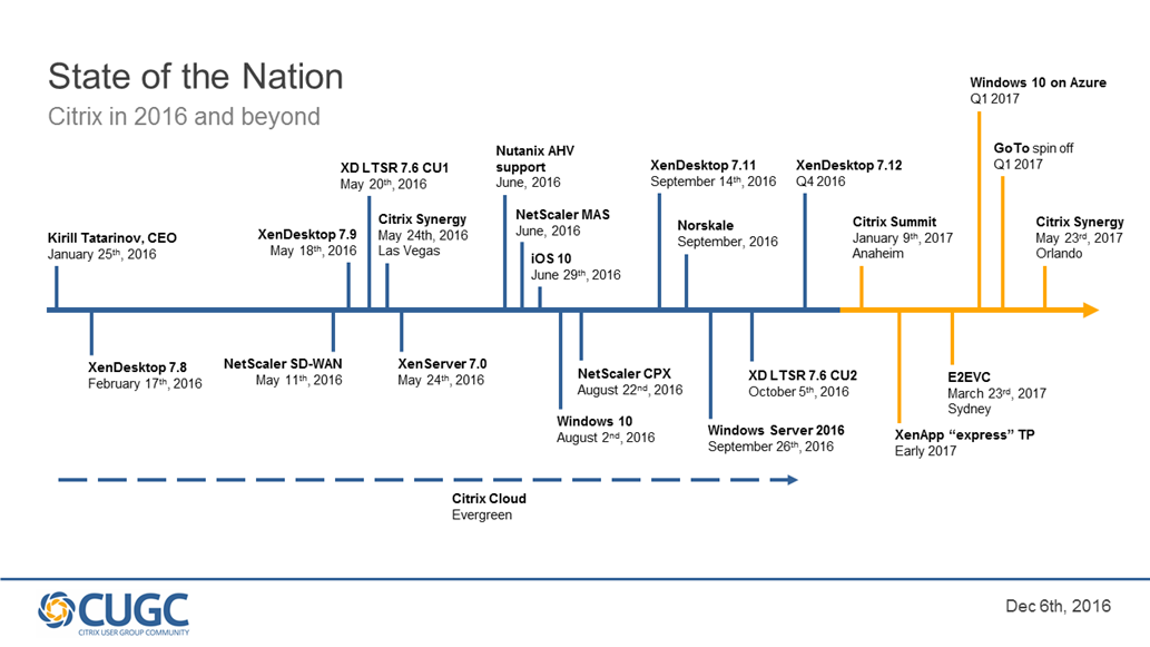 At the first Melbourne Citrix User Group meeting last December, I presented the following overview of the timeline for Citrix over 2016 with a few things coming up in 2017.