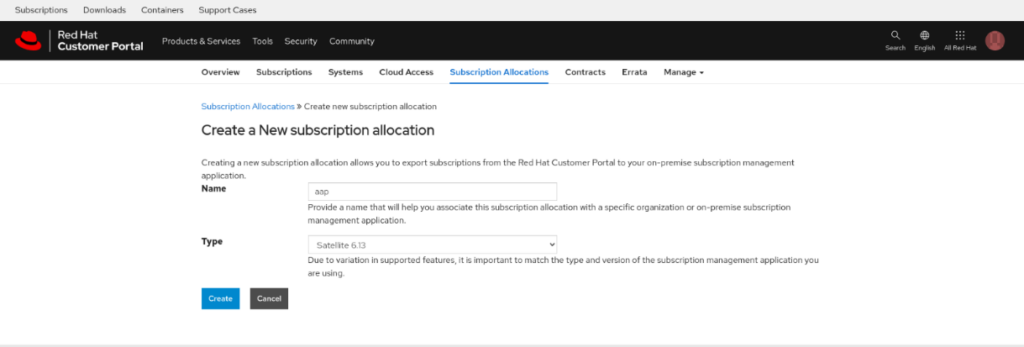 - Click on New Subscription Allocations. Specify the name ‘aap’ and Type ‘Satellite 6.13’ and click Create