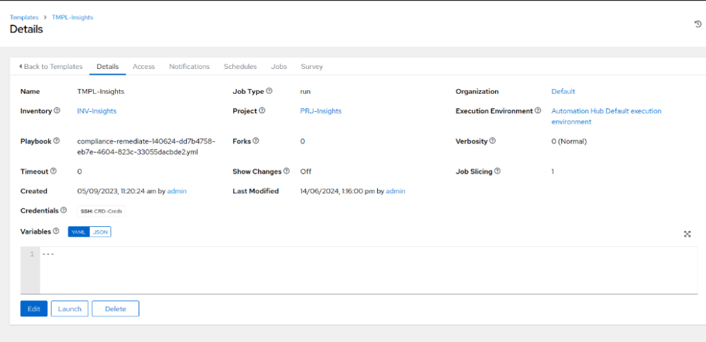 - Wait until the Project Job finishes successfully and navigate to the Templates. Find the Template you use with the Insights project, edit it and select the playbook we created in Insights section of cloud.redhat.com: