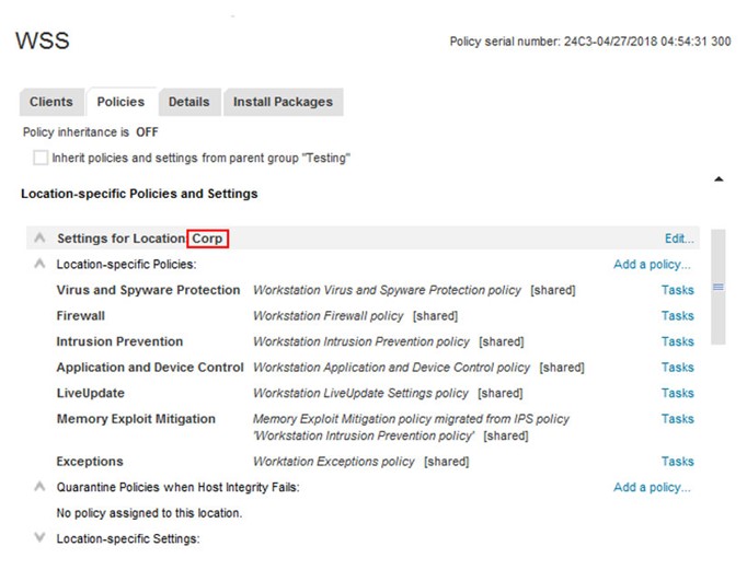 If the user logs onto their computer and the computer is on the corporate network, the SEP client will be able to connect to the SEPM server. The SEP client will set automatically set the location to “Corp”. When the location is set to Corp there is no Integration policy applied and all web traffic will be directed to WSS by the Firewall/VPN connection.