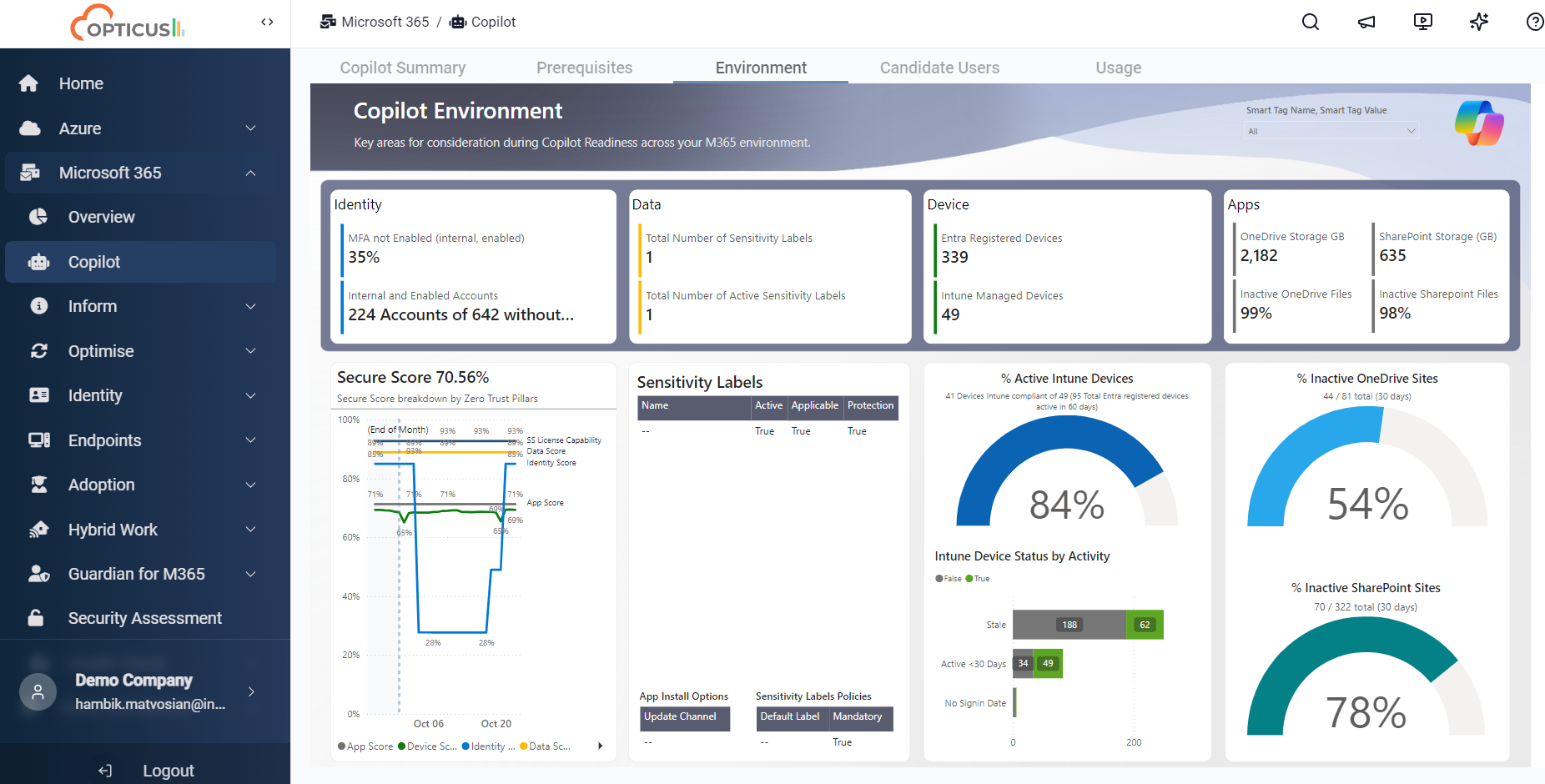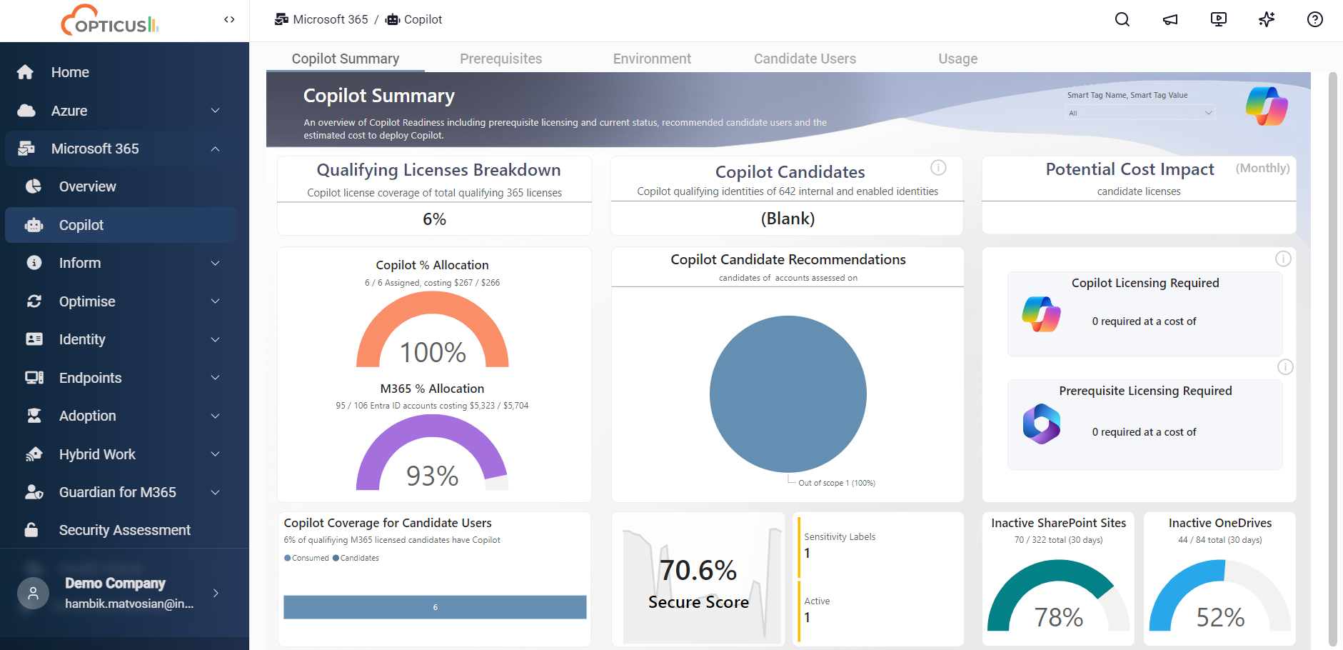 Opticus’ Copilot insights are designed to support every stage of the Copilot journey – from checking prerequisites and readiness, through to adoption and evaluating candidate users.
