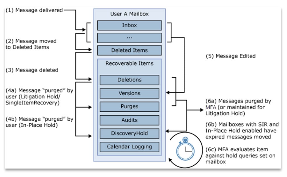 The RIF is a hidden folder inaccessible by the user irrespective of license type or permissions. The size quota hard limit for Primary mailbox RIF is 30GB, however, this is increased to 100GB when a license is applied and Litigation Hold is enabled. The following diagram from Microsoft provides an overview of how items are managed in the RIF.