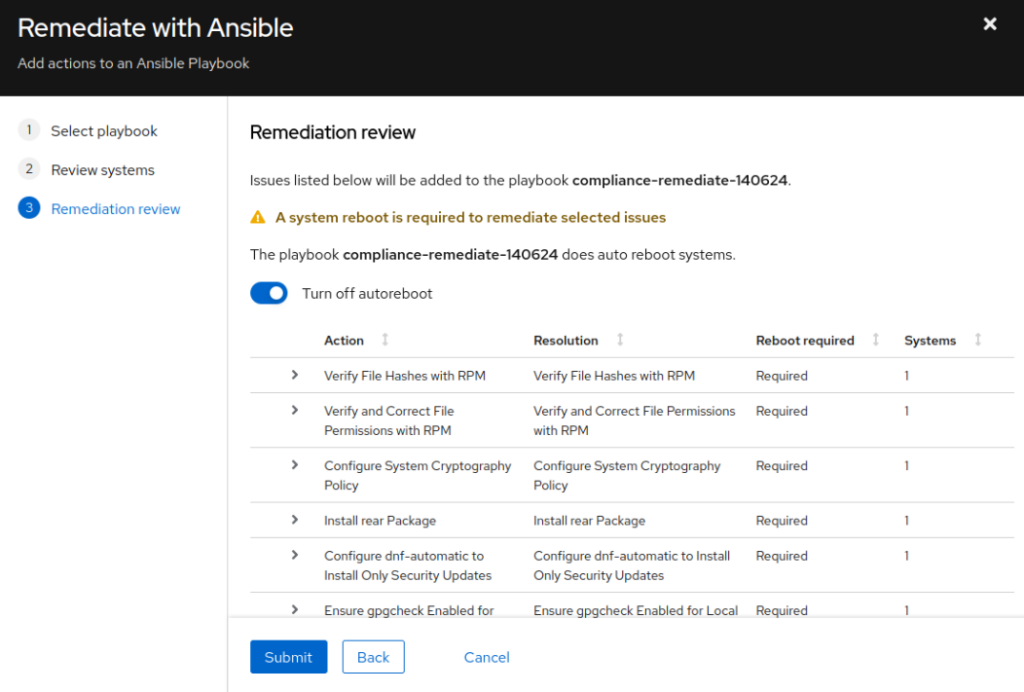 - Verify the Remediation Review and Turn off autoreboot, if necessary. Click Submit