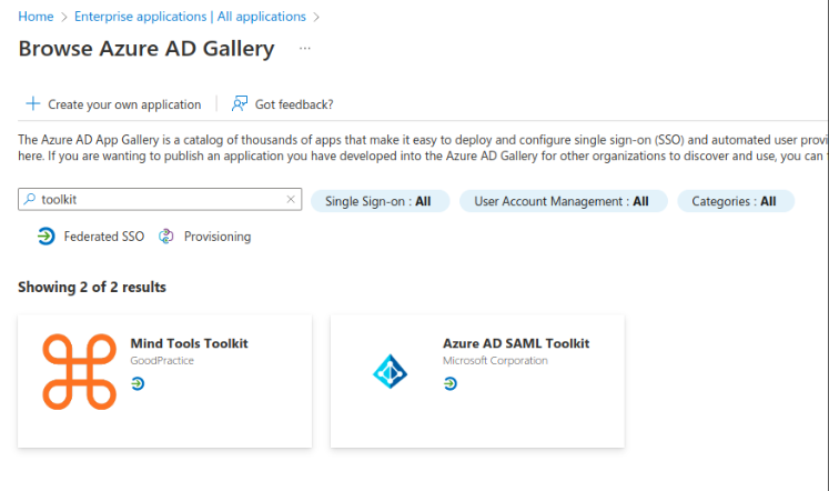 - In the Browse Azure AD Gallery, type Toolkit and click on Azure AD SAML Toolkit